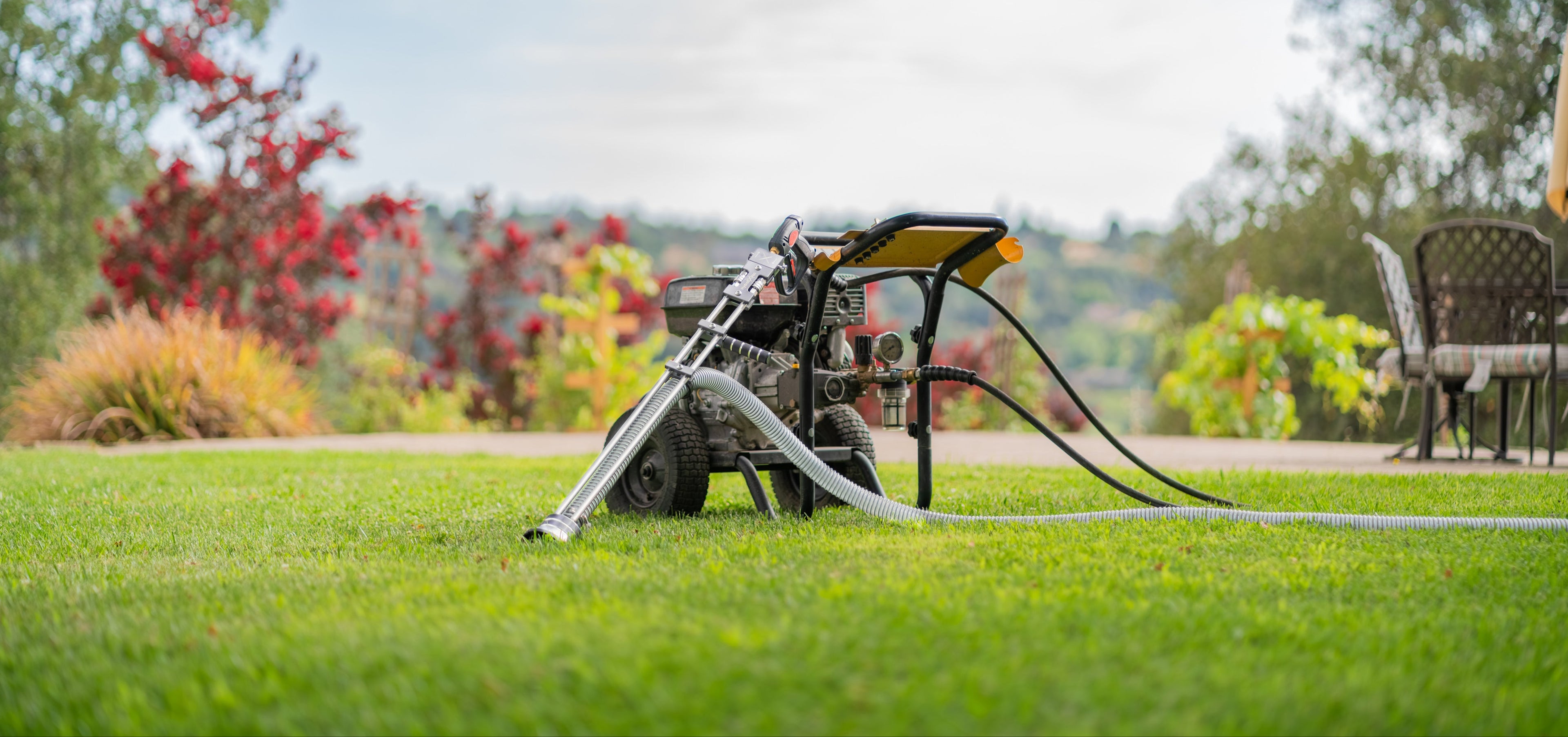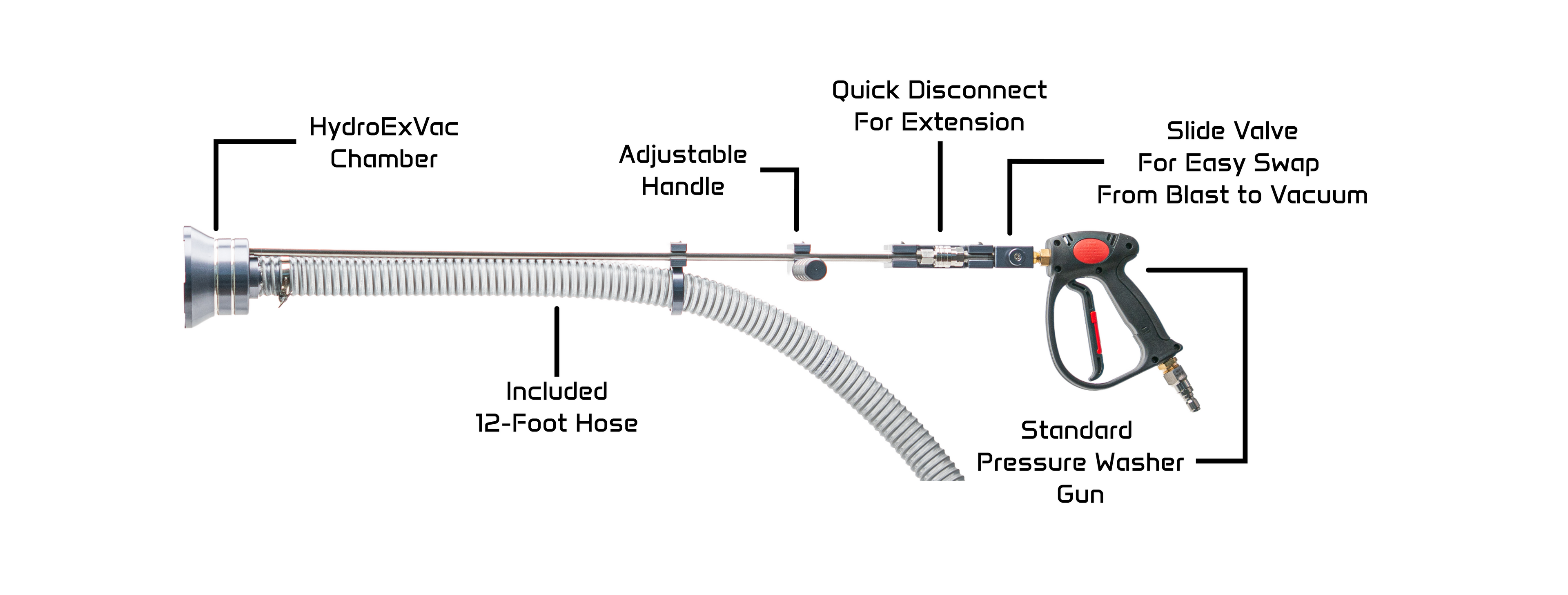 The HydroExVac turns your pressure washer’s water flow into suction via venturi, so no separate vacuum is needed.